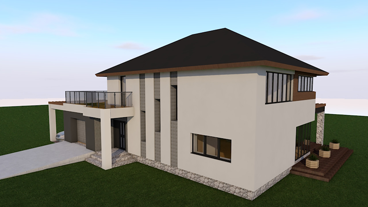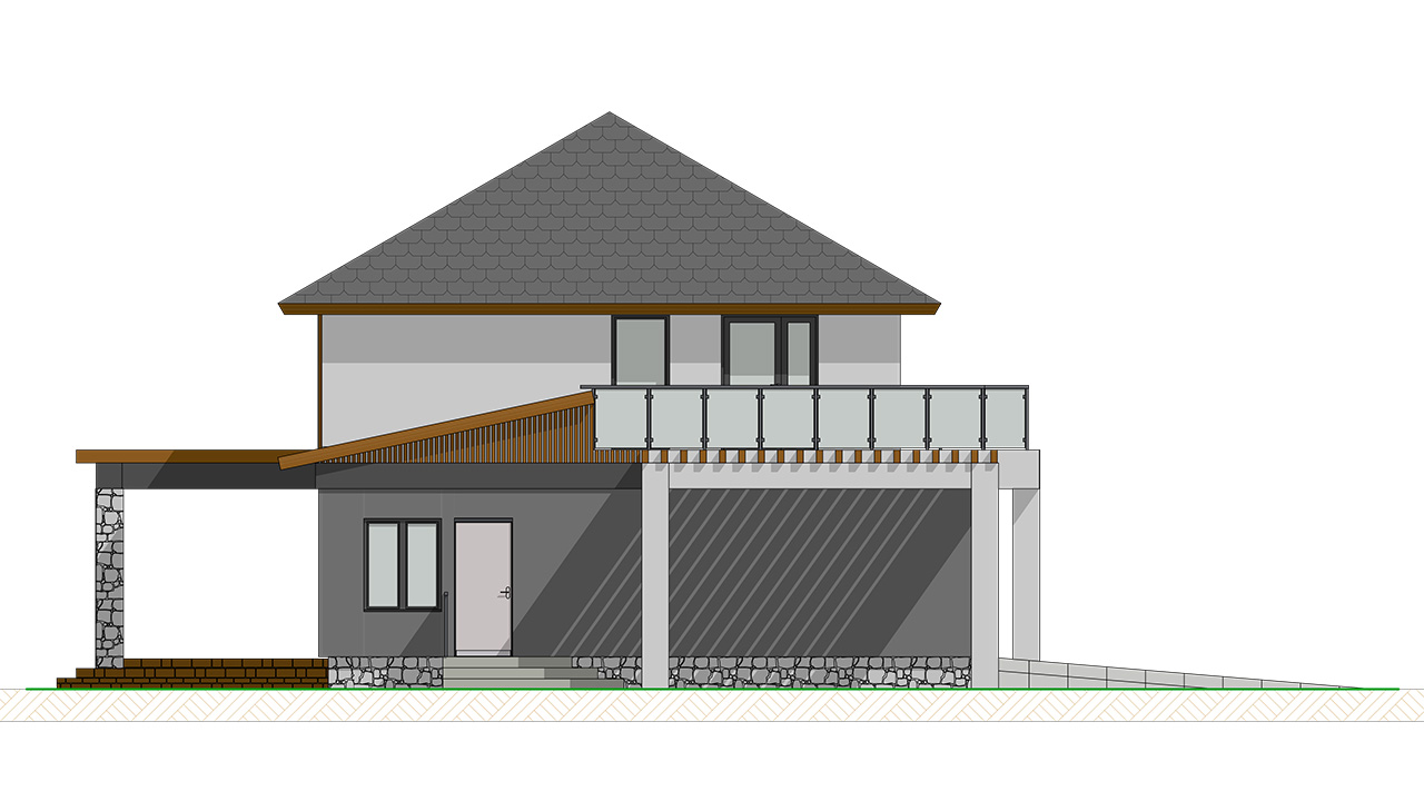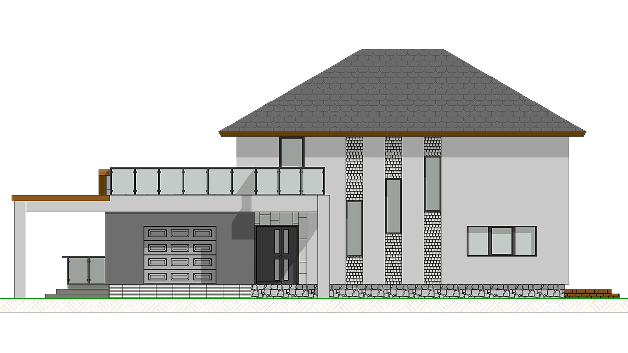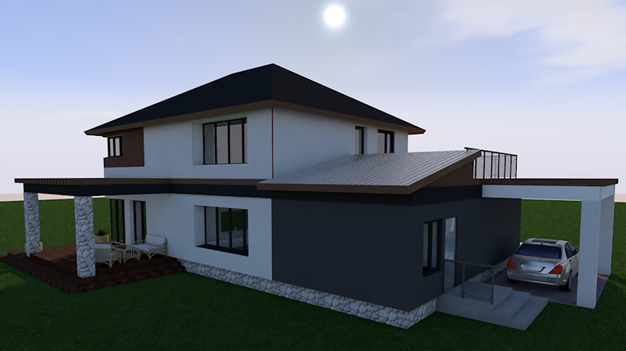 Гараж та топкова розміщені в об’ємі будинку. Дві тераси – відкрита на другому поверсі (над гаражем) та крита на першому поверсі з виходом із вітальні. Навіс для авто біля гаража.