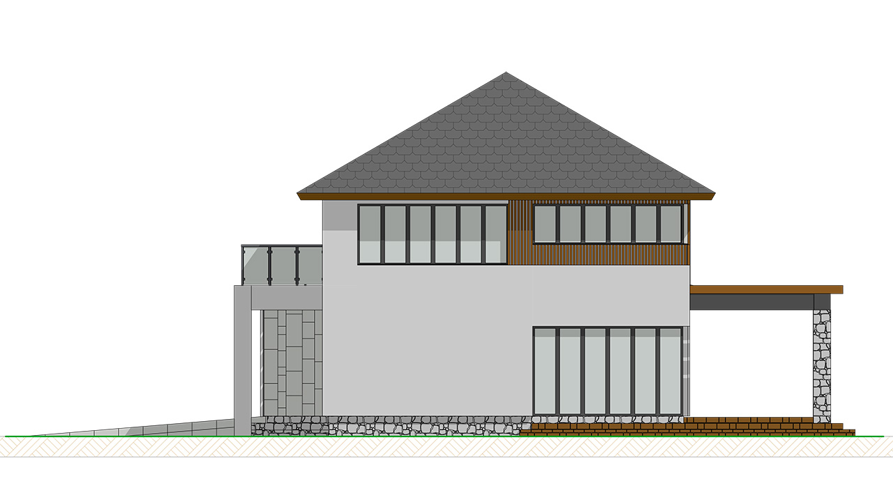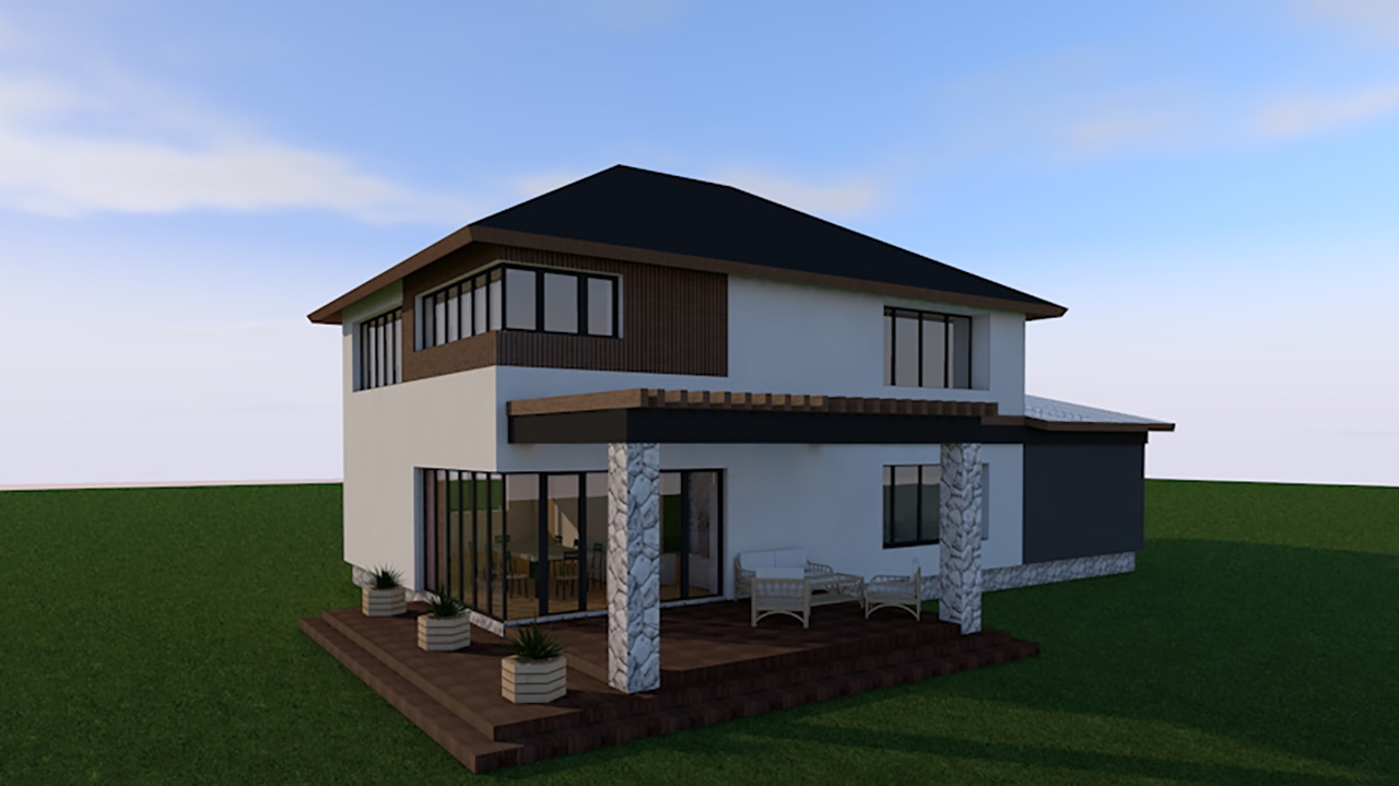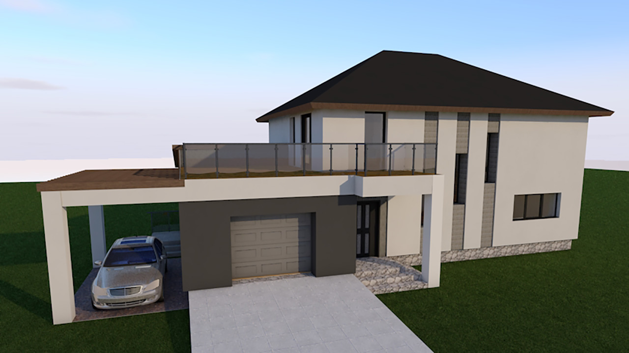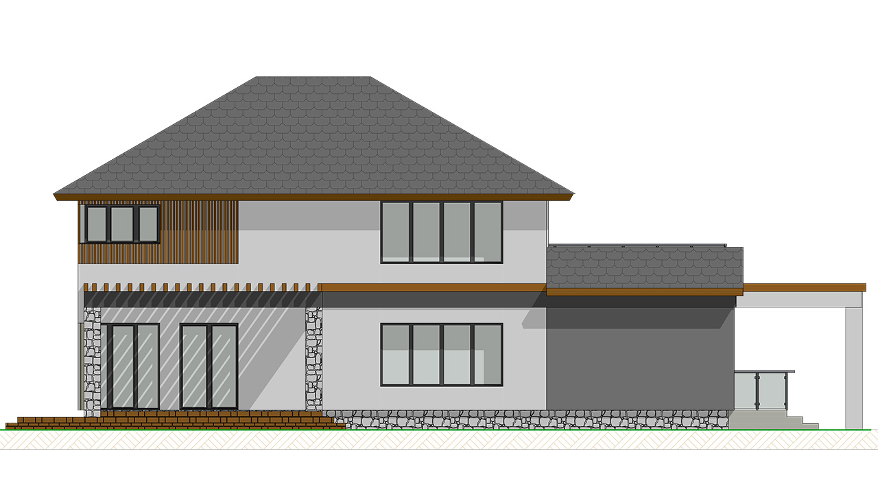 Гараж та топкова розміщені в об’ємі будинку. Дві тераси – відкрита на другому поверсі (над гаражем) та крита на першому поверсі з виходом із вітальні. Навіс для авто біля гаража.